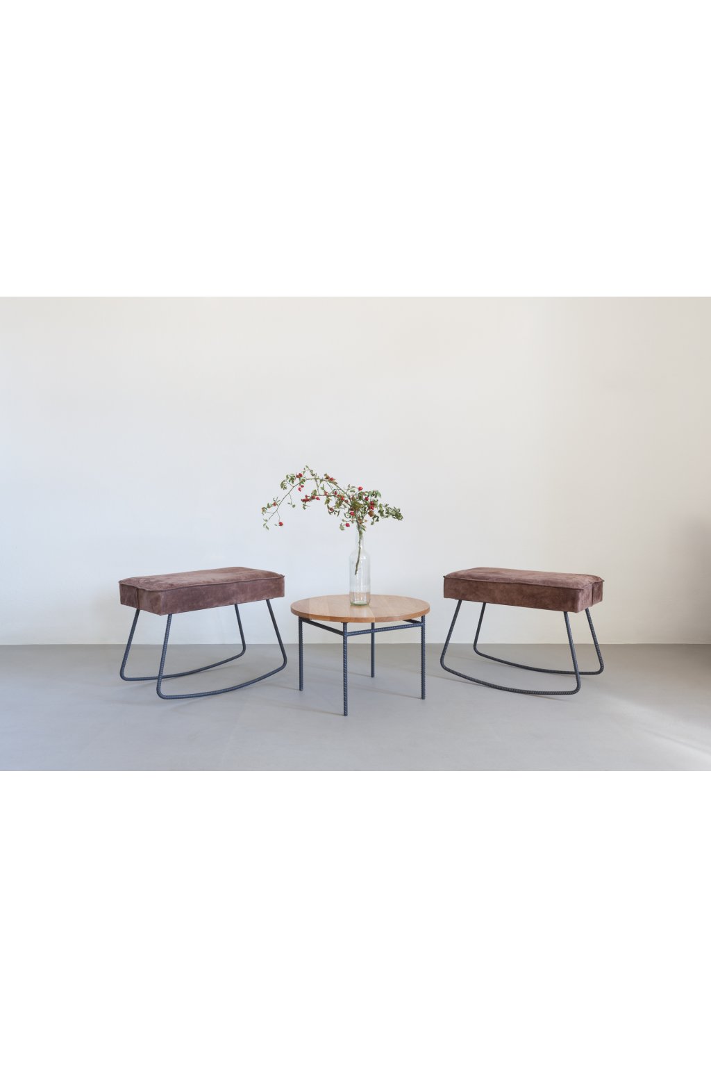Kulatý konferenční stolek kombinuje přírodní dřevěnou desku s subtilní konstrukcí z