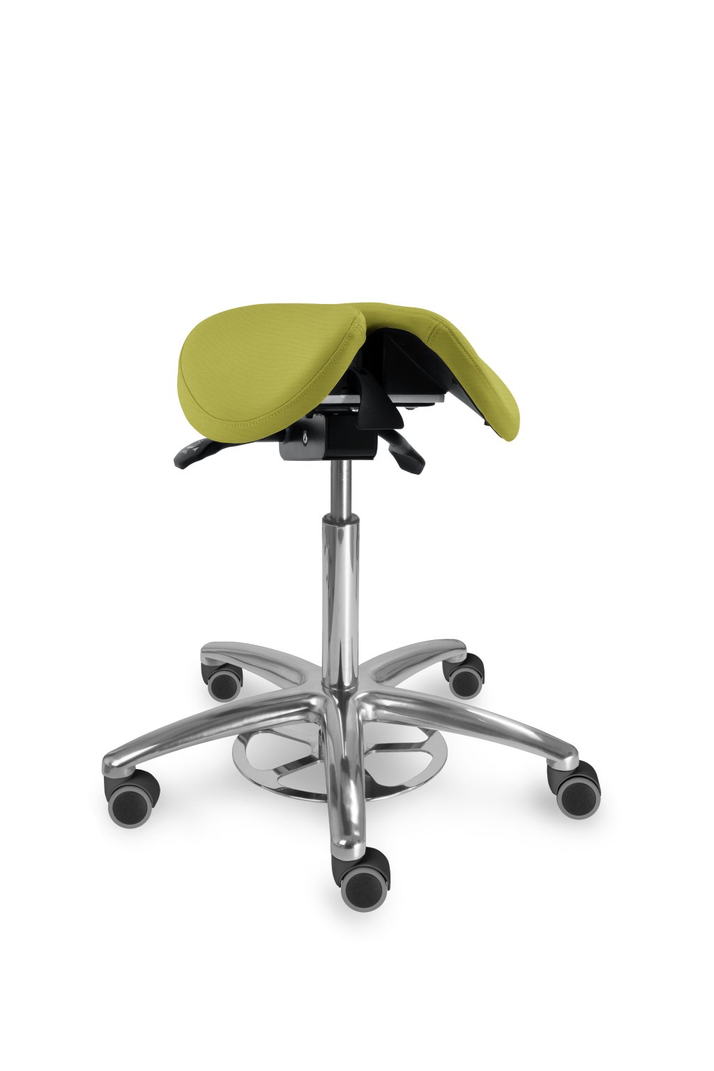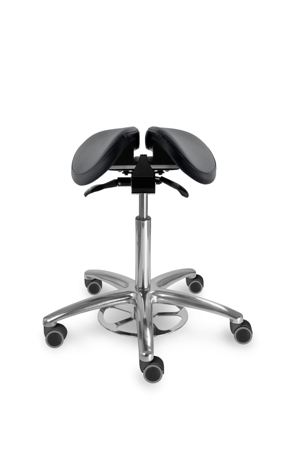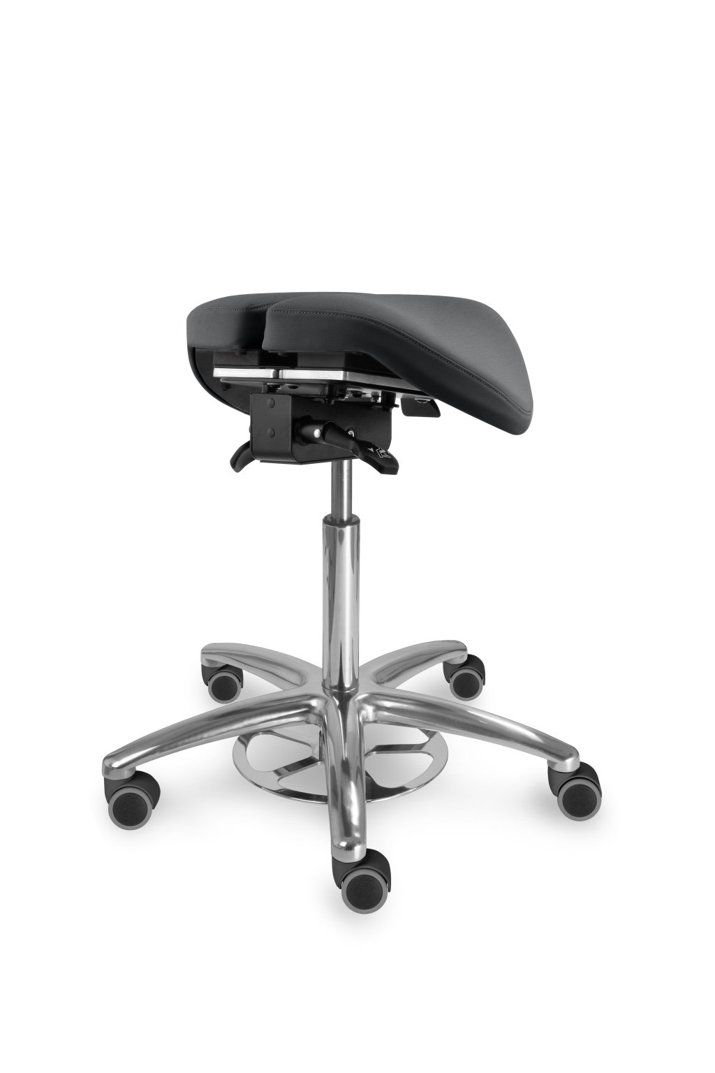Speciální sedlová stolička s děleným tvarovaným sedákem. Vhodná pro ordinace, laboratoře, učebny a jiná pracoviště, kde je z hlediska hygieny potřebné nastavit výšku sezení nohou, snadná údržba