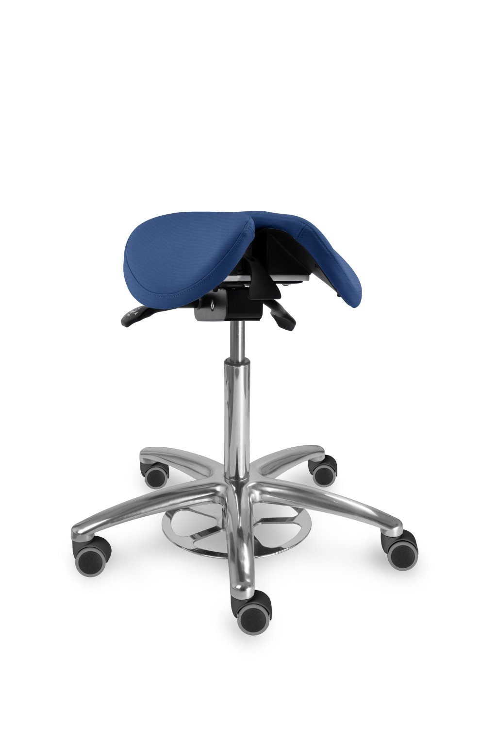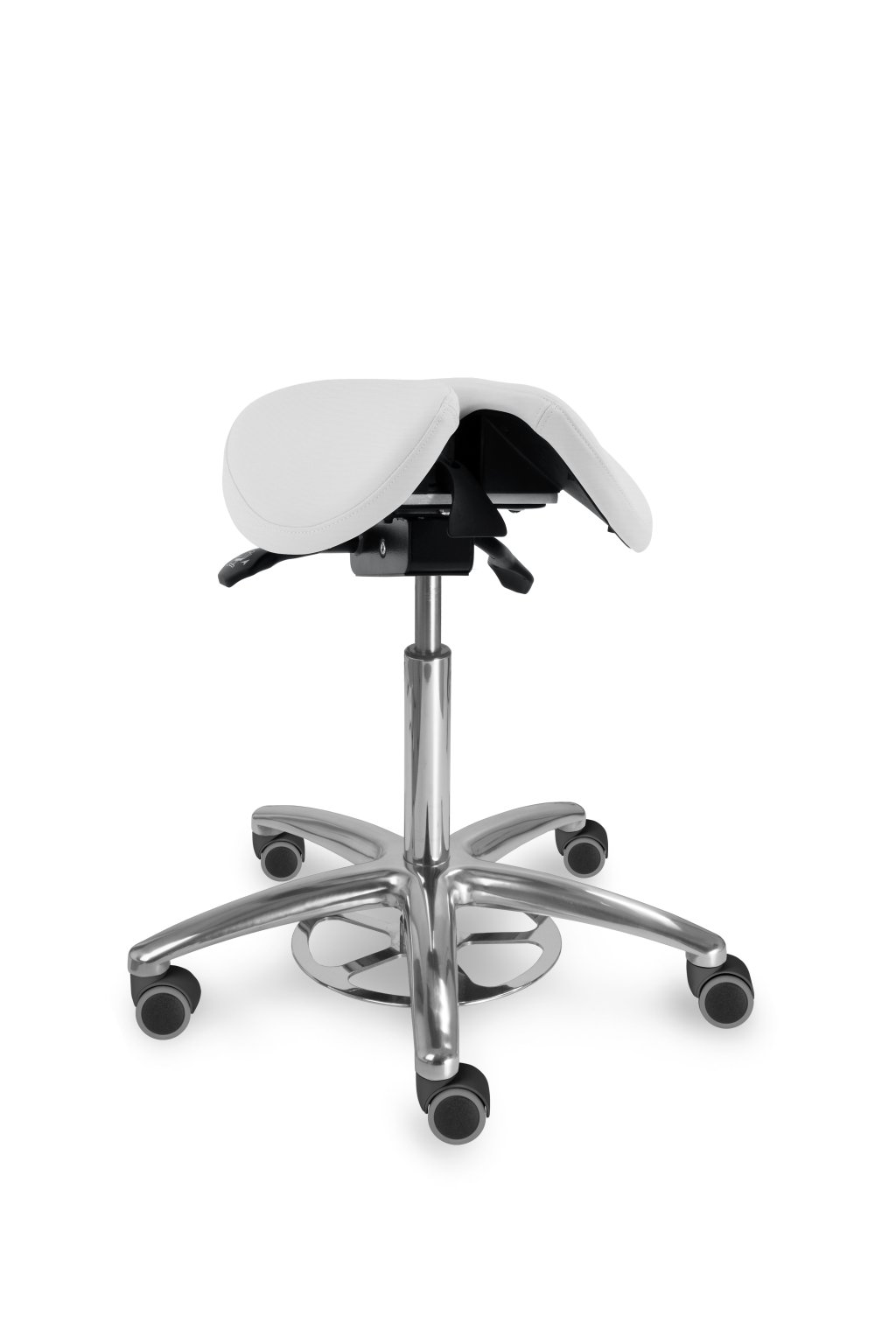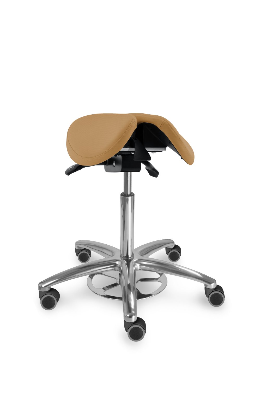 Speciální sedlová stolička s děleným tvarovaným sedákem. Vhodná pro ordinace, laboratoře, učebny a jiná pracoviště, kde je z hlediska hygieny potřebné nastavit výšku sezení nohou, snadná údržba