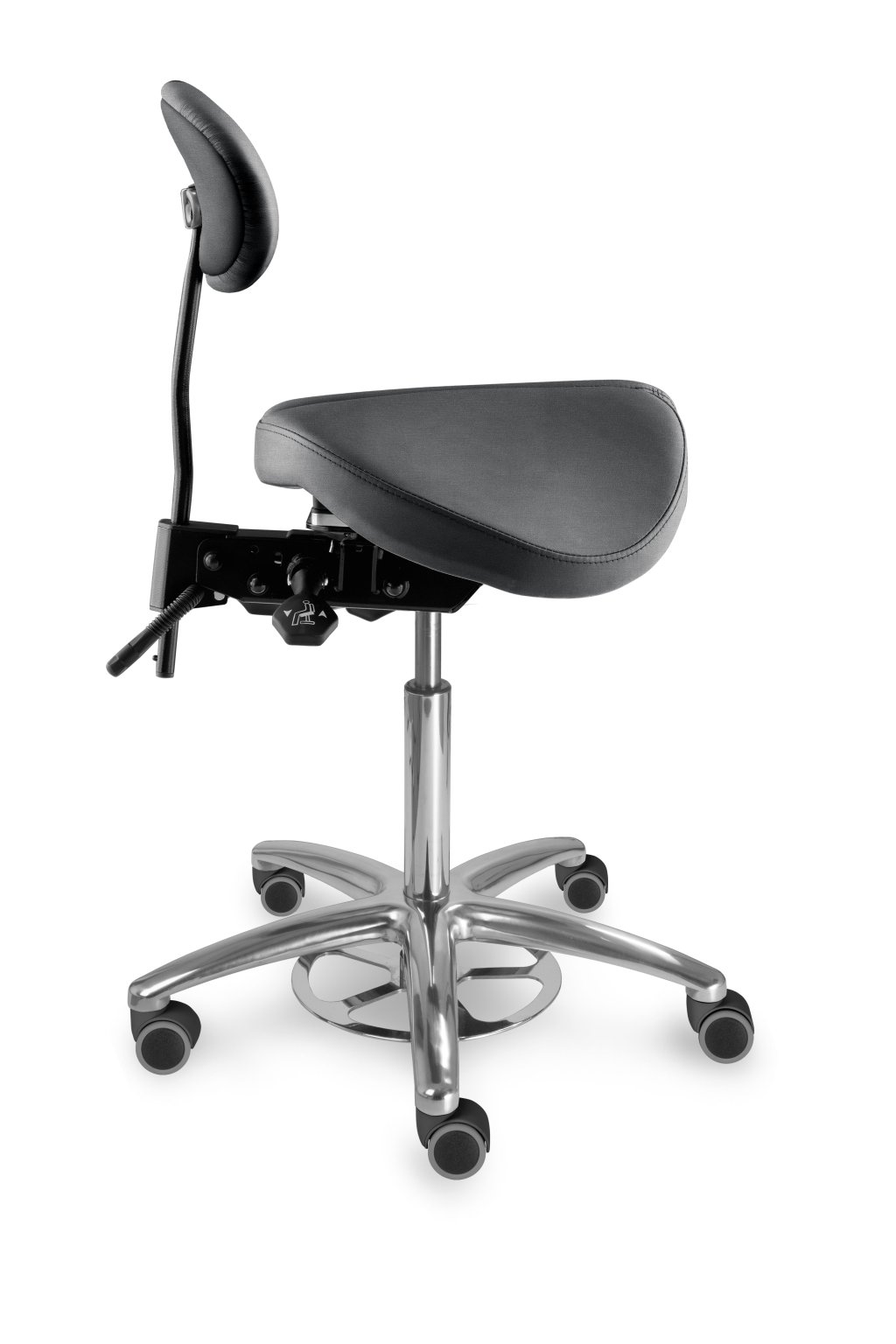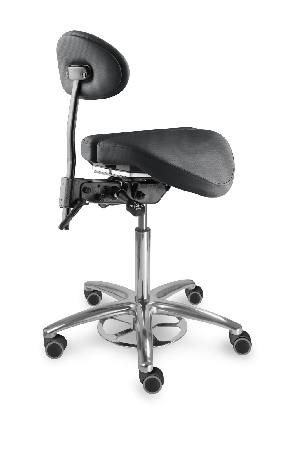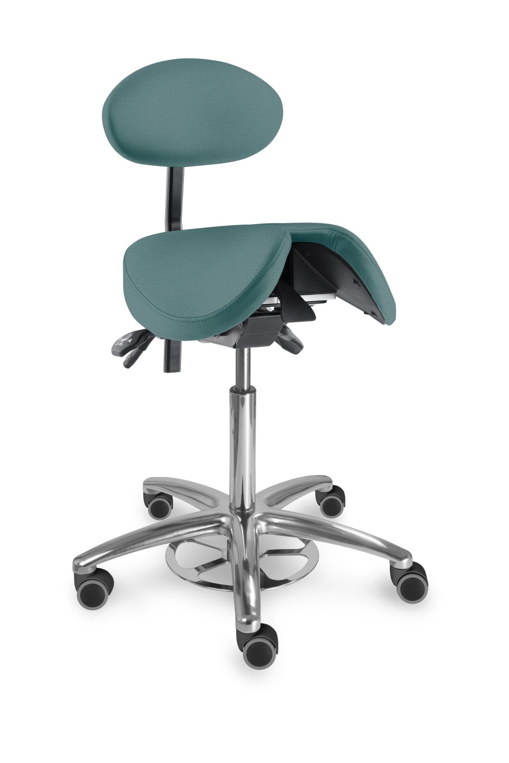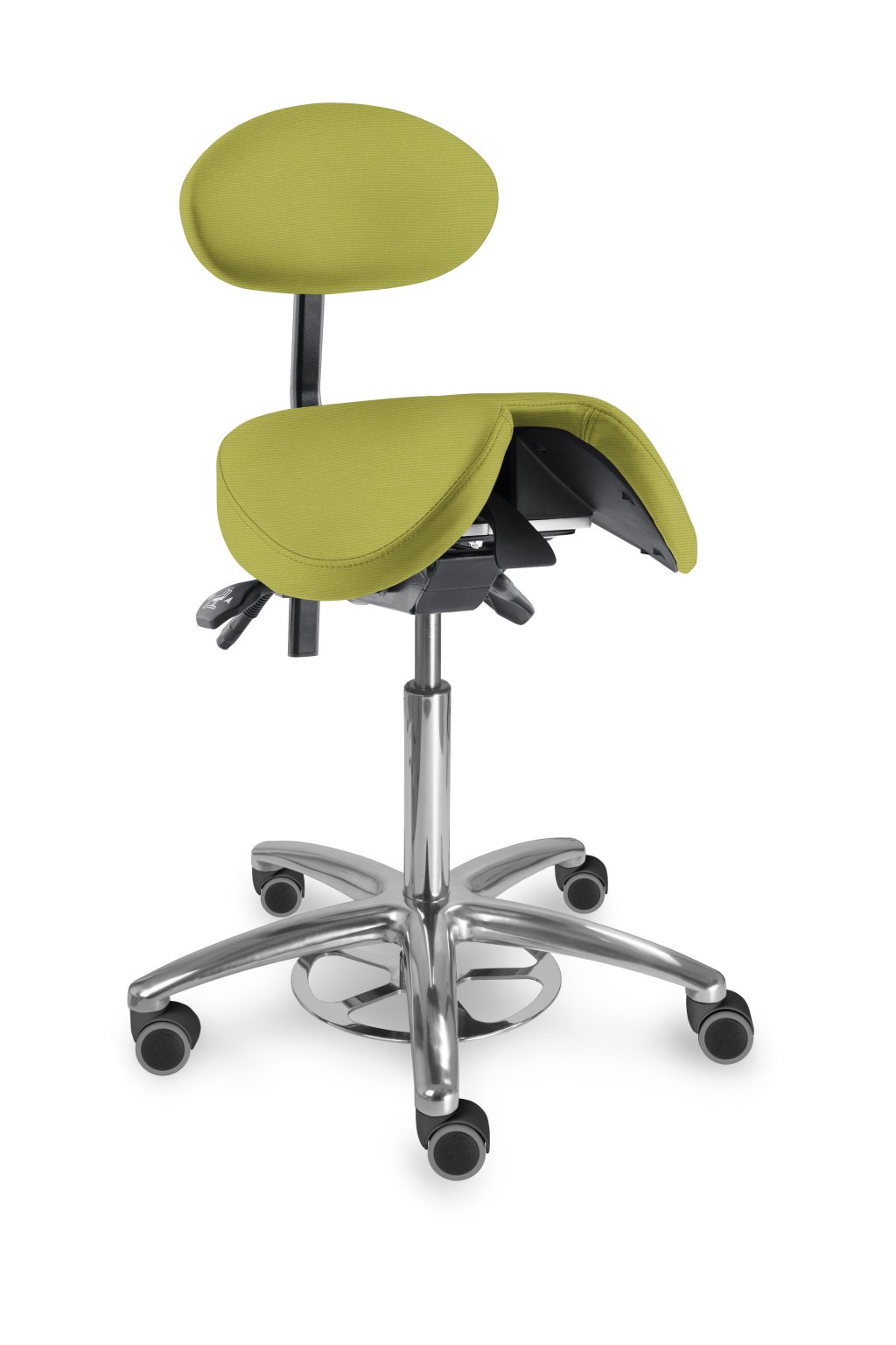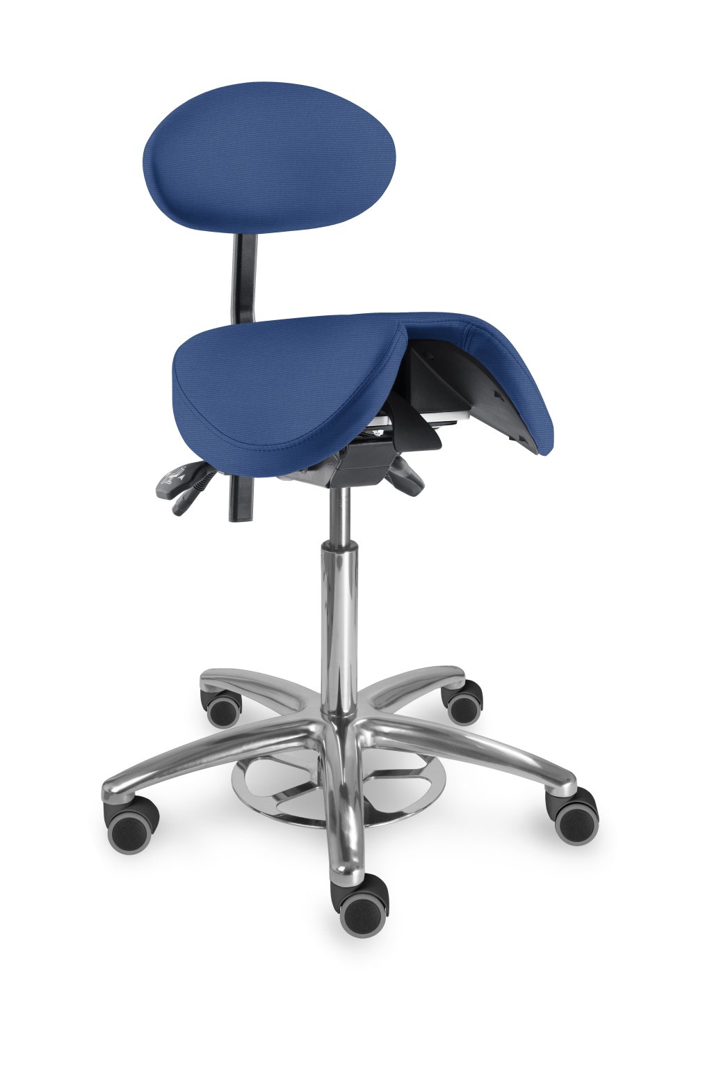 Speciální sedlová stolička s děleným tvarovaným sedákem a s opěrkou zad. Vhodná pro ordinace, laboratoře, učebny a jiná pracoviště, kde je z hlediska hygieny potřebné nastavit výšku sezení nohou, snadná údržba